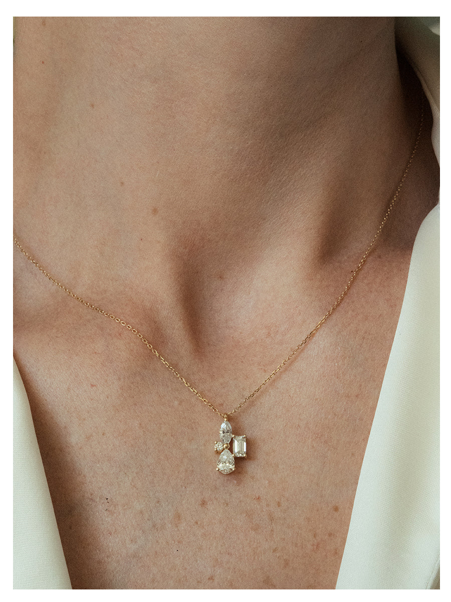 贅沢に4つのシェイプのダイアモンドを組み合わせ、女性が持つ多面的な魅力を表現。 愛、信頼、調和、自立を叶え、 “人生の歓び” を存分に味わいたい。 そんなあなたへ贈る、ユニークでエレガントなジュエリーです。