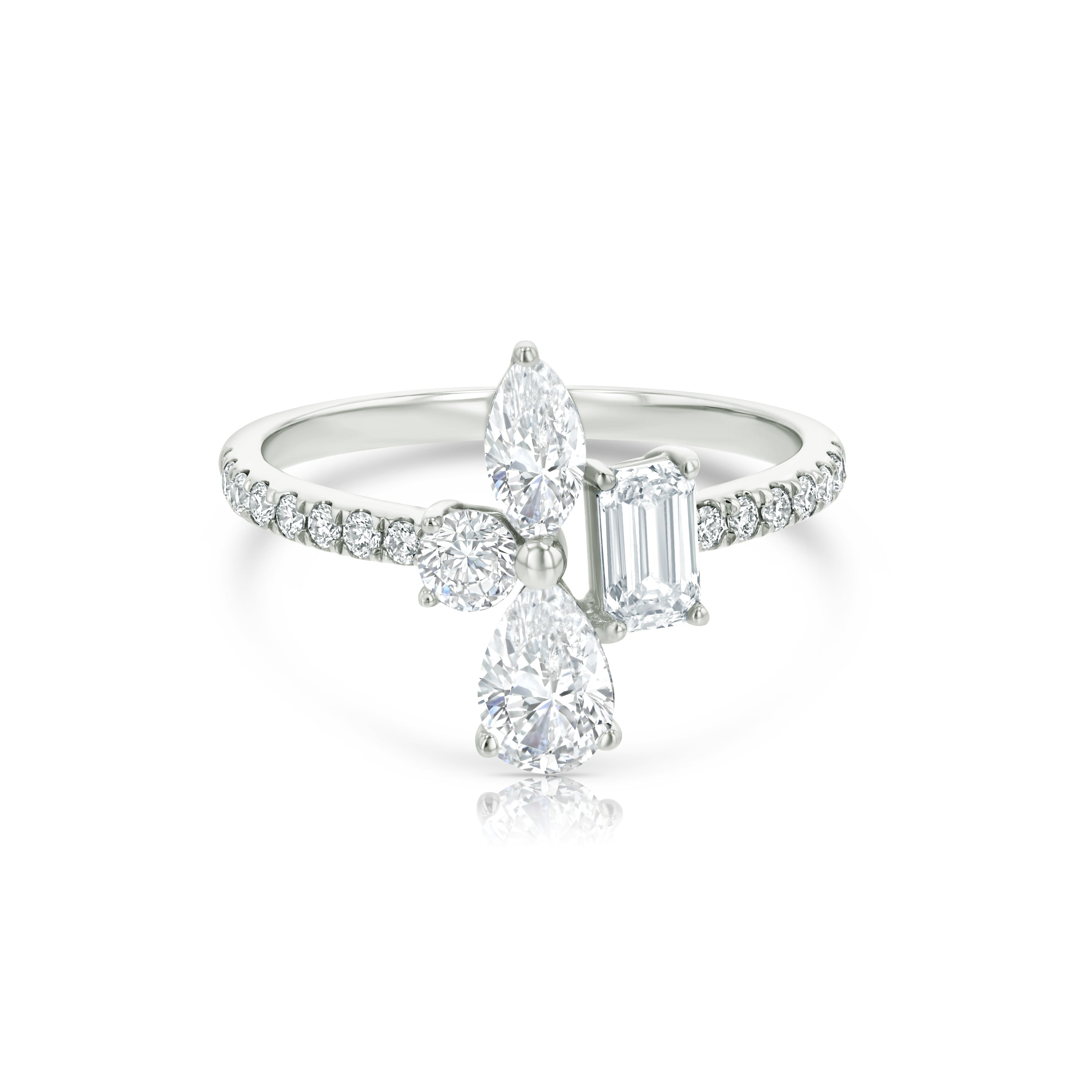 贅沢に4つのシェイプのダイアモンドを組み合わせました。カットによって異なる個性とも言える輝きの違いは、女性が持つ多面的な魅力と同じ。  “人生の歓び” を存分に味わいたい。 そんなあなたへ贈る、ユニークでエレガントなリングです。